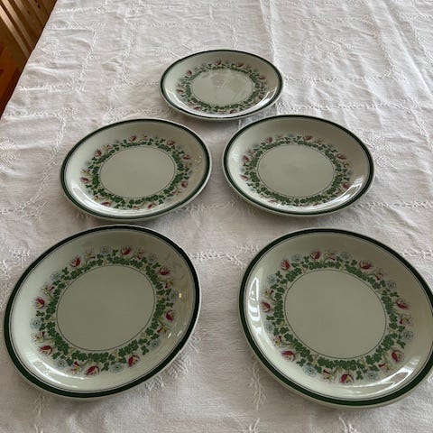 8 stk tallerker/asjetter, diam 17,3 cm, en stk har nag kant, se bilde. Flotte til kaker, brødskiver, eller som sidetallerken på middagsbord.