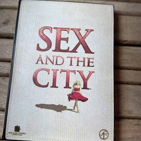 Sex and the City The Essential Collection DVD sett med flere sesonger. Dekket har rosa bakgrunn med svart dekorativt mønster og tekst. Passer for fans av TV-serien.