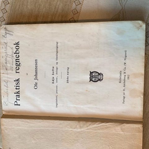 Antikk, Praktisk Regnebok fra 1912. Hentes. Kr. 50,-