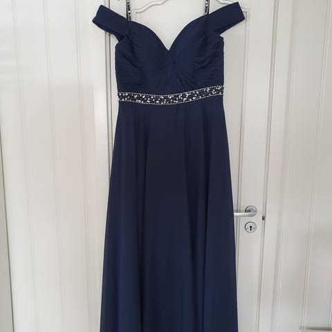 Floyd festkjole i blå farge, størrelse 40. Kjolen har dekorative detaljer på overdelen og en lekker passform. Materialet er lett og egnet for formelle anledninger. Kjolen inkluderer et sjal som kan knytes bak, som vist på bildene.
