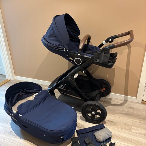 Stokke barnevogn i blå farge med robust ramme og justerbart håndtak. Vognen har en komfortabel liggedel med polstret innside, egnet for nyfødte. Sittedelen har 5 punkts sele og justerbar fotbøyle. Ekstra polstret pute for sittedelen følger med. Fire hjul gir god stabilitet og enkel manøvrering. Inkluderer oppbevaringskurv under og tilhørende veske. Passer for barn fra nyfødt alder og oppover. Vogna må hentes i Porsgrunn.