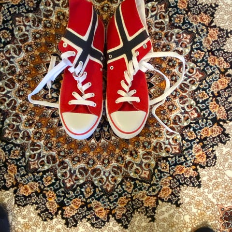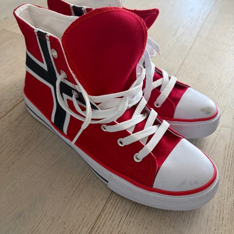 University 'converse' sko med norske flagg på sidene, til russetida 🇧🇻. Unisex. Str 43, normal i størrelsen. Rød.