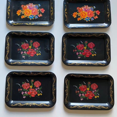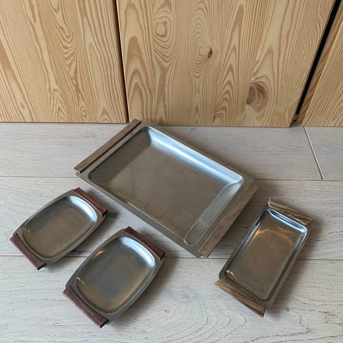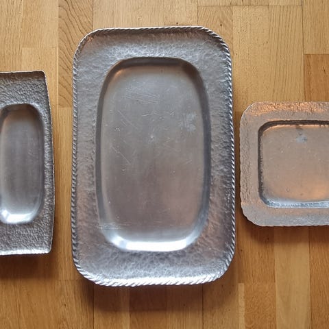 Det største målet 24 x 34 cm og det lille 16 x 30. Usikker på materiale, men tror det kan være tinn.