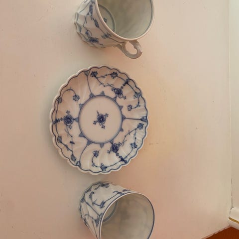 Tittel: Porsgrund Bogstad Stråmønster – 2 sett kopp, skål og asjett (1950)
