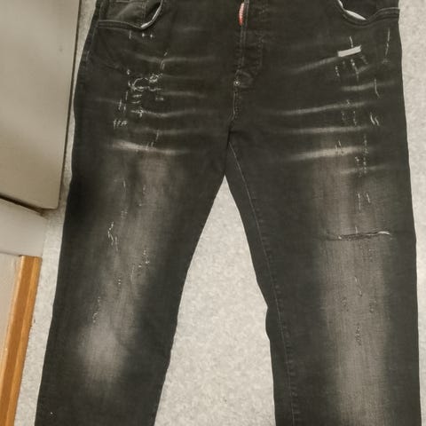 Størrelse 50 - sitter som large. Mangler en knapp nederst i gylfen, men går helt fint å lukke den.