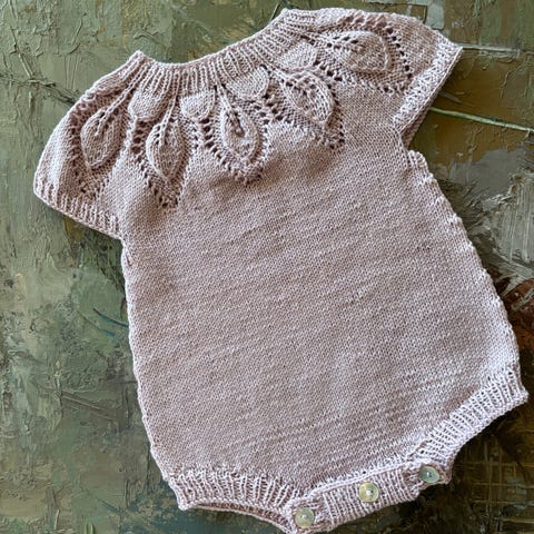 Romperen kan brukes fra babyen er ca. 4-5 mndr. Lengden er 40 cm fra toppen av skulderen til skrittet. Den er ny, vasket med Milo og strikket med Drops Baby Merino, et mykt og kløfritt ullgarn. Romperen koster 250 inkludert hårbånd.