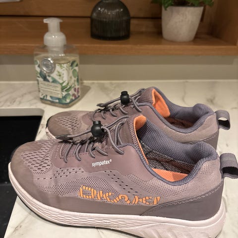 Selger et par brukte joggesko fra Dkaki i størrelse 35. De er svarte med oransje detaljer.