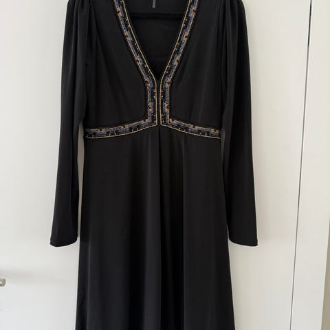 Helt nydelig kjole fra Hale Bob i str. S selges. Kjolen er halvlang, og rekker meg til knærne (jeg er 174 cm høy). Ermene er lange, og kjolen har en fold foran som gjør at den faller veldig pent. Den har v-utringing og er foret hele veien, så den er ikke gjennomsiktig. Laget av polyester og elastan, og en perfekt reisevenn siden den ikke krøller seg. Nydelig fargepalett i hvitt, blå- og lillatoner. Selges med tungt hjerte fordi den dessverre er for liten. Perfekt til jul!