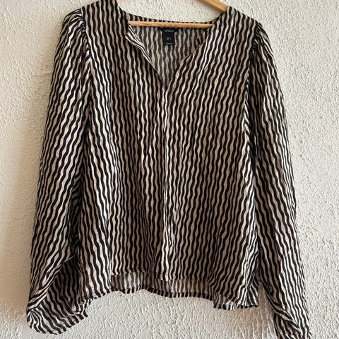 Blusen har løstsittende ermer med kimono-fasong, og snøring i midjen for justering. Materialet er lett og egnet for hverdagsbruk og fest. Hel lengde: 56 cm
