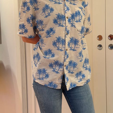 RJC Hawaiian skjorte i flerfarget mønster, størrelse S. Skjorten er laget i Hawaii, USA, og har kort erme og knappelukking. Amerikansk XS tilsvarer S her