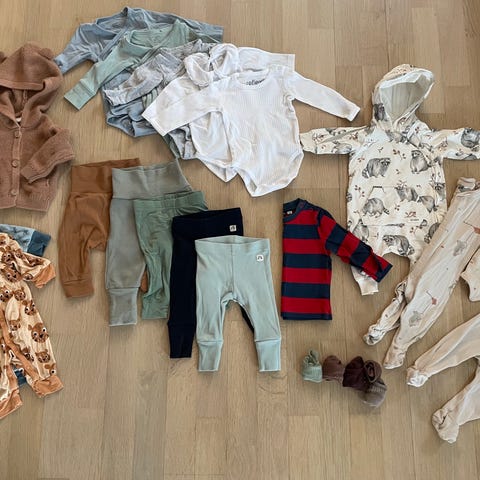 Selger en pakke med babyklær i størrelse 80. Pent brukt, uten flekker eller hull. Bodyer, bukser og pysjer.