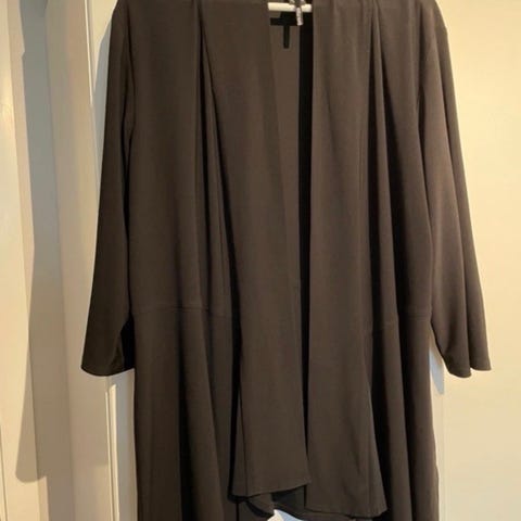 Brun, lang jakke rimelig til salgs for 200 kr. Selges som den er. Polyester/elastan. Romslig modell. Fin om høsten med god genser inni.