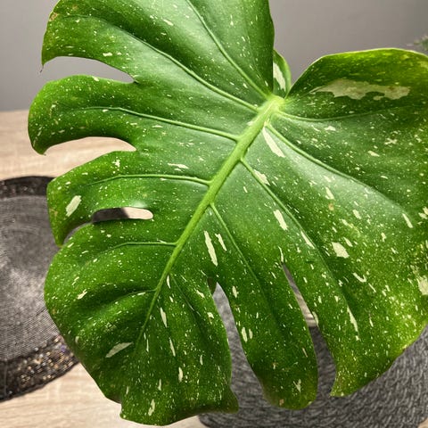 En stikling med fire blader av typen Monstera Variegata. Fine hvite felt på bladene.