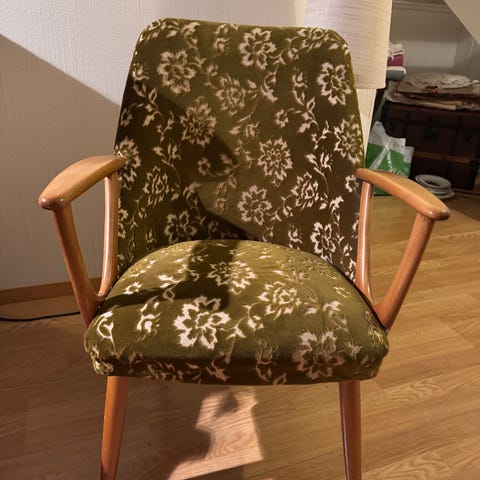 Har to stk. Pent brukte. Malt over med blålig farge. Kan enkelt trekkes om.