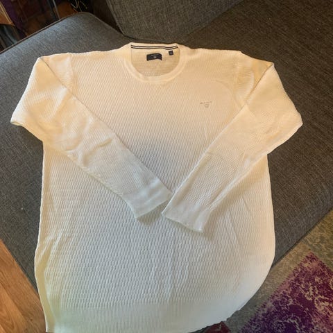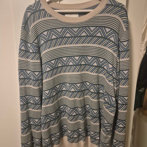 Bula genser i størrelse M for menn. Genseren er hvit med et mønster i blått. Materialet er ikke spesifisert i bildene. Passer til hverdagsbruk.