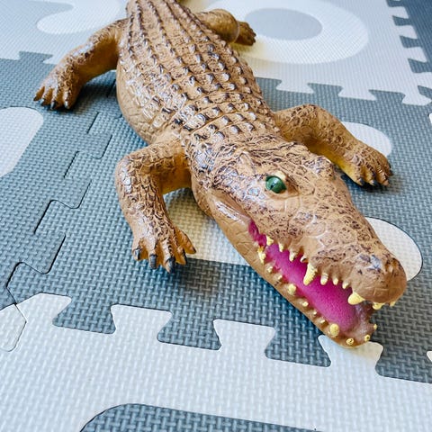 Krokodille Lekefigur i plastmateriale med detaljerte trekk. Figuren er realistisk utformet med åpen munn og teksturert kropp. Den er ca 80cm lang. Ser at grønnfargen er slitt av div steder.