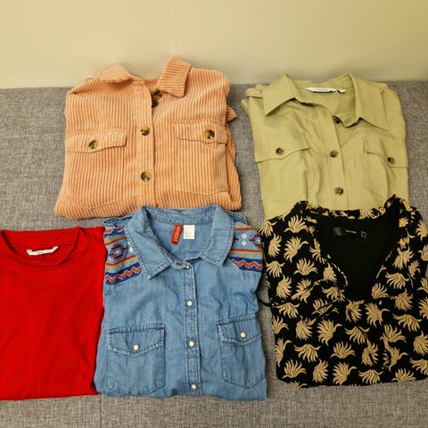 Selger en klespakke med 15 plagg i str L til dame. Mange fine plagg som er lite og pent brukt. Noe er ubrukt. 3 cardigan fra Ichi med litt lengde i fine farger. En i burgunder, en i okergul og en i grønn. 2 overdeler fra Soaked in Luxury. En mørkeblå med hvite prikker, og en grønn med prikker. En velour jakke i rød fra Cubus. En nattskjørte med lappen på fra Cubus. En capri linbukse fra VaVite i mørkeblå, og en oransje jakke med knapper fra VaVite. En lilla ulltrøye fra Devold. Et dongeriskjørt fra Jean Paul. En mørkeblå overdel fra B-young. En hettegenser fra Kaffe i leopard. En genser i en fin cerise farge fra Fransa, og en jeans i svart med lappen på fra Cubus. Selges samlet til 800,-