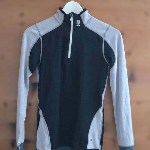 Helt ny og ubrukt genser med lappen hengende på fra norsk kvalitetsmerke STORMBERG i mørke grå farge og fin blå farge rundt halsen, selges veldig billig.