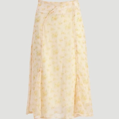Dette er et langt skjørt i sateng med et blomsterprint i varme toner på en lys gul bunn. Den kroppsnære passformen skaper en elegant silhuett, og en diskret glidelås i ryggen gir en ren avslutning.