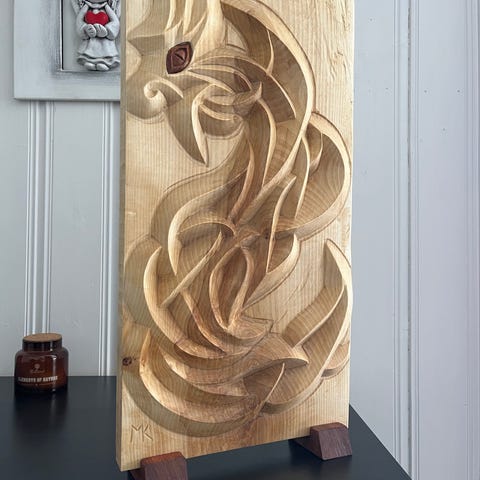Unik treskulptur laget av en naturlig rot/grein, montert på en trebase. Skulpturen har en organisk, vridd form som fremhever naturens egne linjer – et vakkert og stilrent kunstverk som passer perfekt som pynt på bord, hylle eller i vinduskarmen.