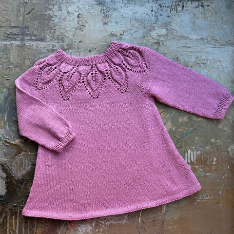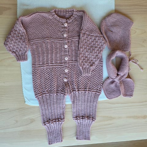 En nydelig babydrakt i pudderrosa babymerino garn fra Merinor.
