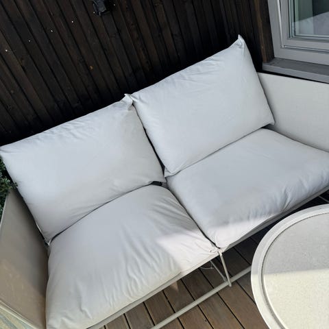Utesofa, Havsten fra IKEA - bestående av en 3-seter sofa med metallramme og puter i lyse farger. Sofaen har tre sitteplasser med løse puter som viser tegn til bruk og slitasje, inkludert flekker og mindre skader på putetrekkene. Passer for utendørs bruk på terrasse eller balkong.