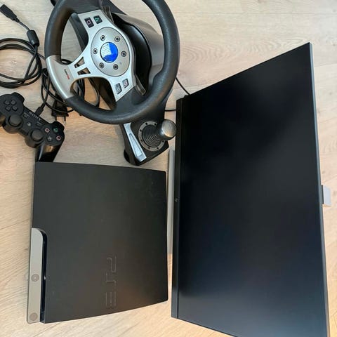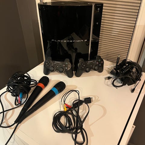 Sony Playstation 3 spillkonsoll med to trådløse kontroller. Inkluderer strøm- og USB-kabler. Konsollen er svart og leveres med en samling spill. Passer for bruk med Playstation 3-plattformen.