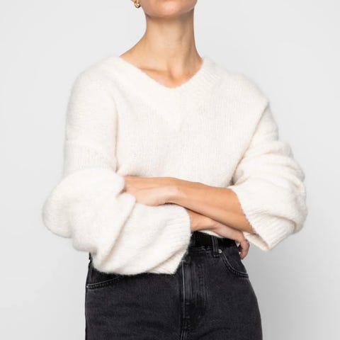 Lou Knit er strikket i en delikat mohair-miks og passer perfekt inn i vårgarderoben. Genseren har lange ermer med senket skuldersøm og ribbet mansjett. Ribbestrikket V-hals og oversized, boxy passform.