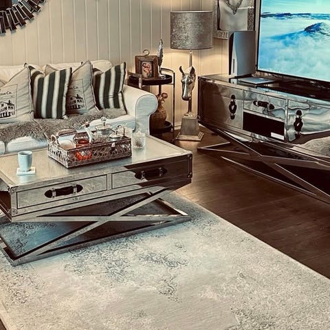 Selger et unikt og moderne sofabord med speilglass-plate og elegante detaljer på sidene. Bordet gir et eksklusivt preg til stuen og passer perfekt til både klassisk og moderne interiør.