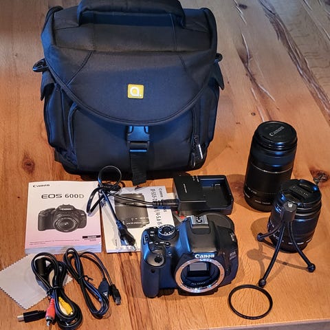 Selger et Canon EOS 600D kamera med reim, batterilader og veske. Et trefot stativ med vater i kan også selges med om ønskelig for et tillegg.