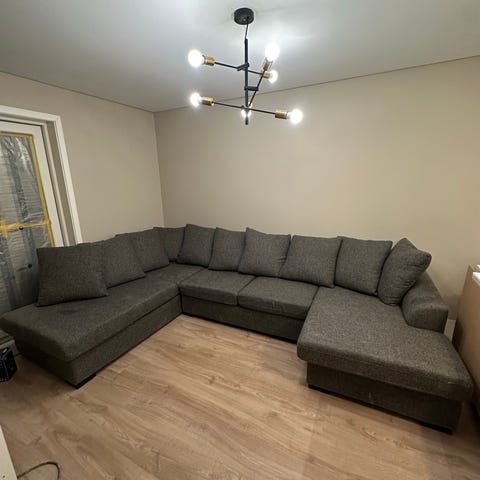 Nydelig og praktisk sofa som passer perfekt i store stuer med plass til mange. Den er neste U-formet med sjeselong på venstre side.