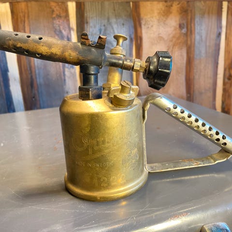 Optimus, Optimus 411, Optimus No 411, blåselampe, blowtorch, messing blåselampe, vintage verktøy, gammelt verktøy, loddelampe, svensk verktøy, primus, samlerobjekt, retro industri, workshop decor