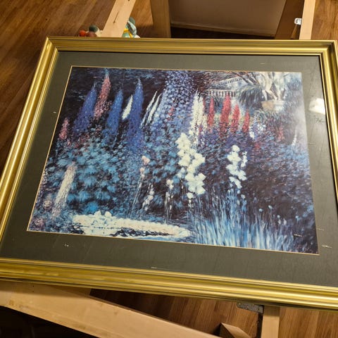 Selger dette bilde, gyldenlær som betyr at det er malt på preget skinn. bilde er 60cm bredt,40 cm høyt.ring tlf 97063479 for mere info,svarer jeg ikke så ring etter kl 19 ,må hentes på Lillehammer.