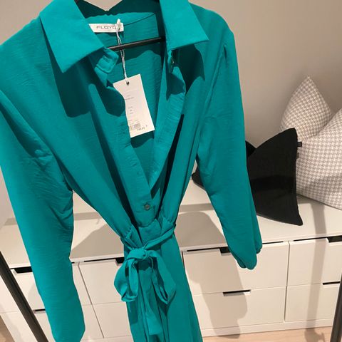 Selger en flott kjole i en frisk grønnfarge. Kjolen er helt ny og kommer fortsatt med lappen på. Størrelse S, med fint snitt og behagelig passform. Perfekt til fest, middag eller andre anledninger hvor du vil skille deg ut med en elegant og trendy look.