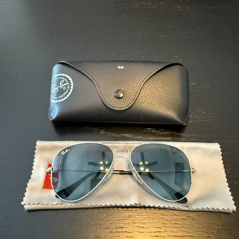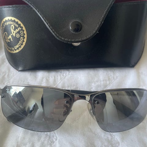 Ray Ban i sølv/mørk grå glass. Noe «skjolder» i fargen på glasset som jeg ikke vet kommer av. Påvirker ikke bruken. Mye brukt, men tatt godt vare på.