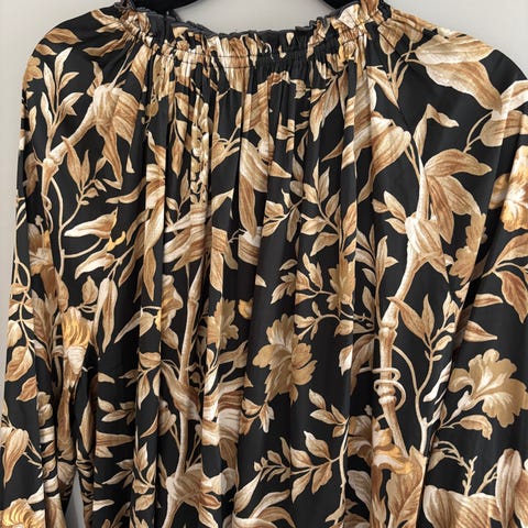 Omslagsbluse med fine detaljer, så som et band du kan knyte i midjan. Dette går at ta av siden blusen kneppes med knapp i siden. Livet er ca 55 cm langt og armene ca 65 cm. Armene er type balong eller puff arm slik at den er litt rommelig ved skulderen og over armen men smal på under armen nedenfor armbind.