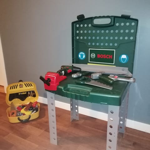 Pent brukte byggeklosser og lekematte. Boksen som klossene ligger oppi følger ikke med.