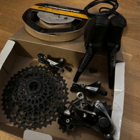 Sram Rival gir- og bremsekomponenter for sykkel, inkludert girhendler, bakgir, krank med kjedehjul, kassett og kjede.. Komplett gruppesett til 1x11 oppsett. Skifter kan ta opp til 36t. Stått på en Canyon Inflite slx. Gxp krank. Byttet ut grunnet oppgradering til di2.