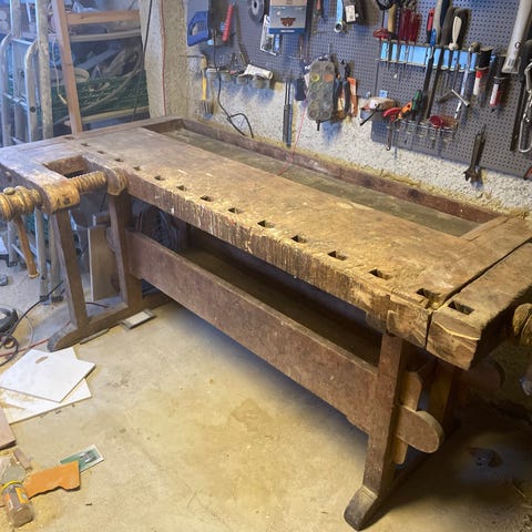 trestokk og håndlaget arbeidsbenk laget av tre. Trestokken er solid og kan brukes som sitte- eller arbeidsstøtte. Arbeidsbenken har en stor, flat overflate egnet for ulike typer verkstedsarbeid. Møblene er robuste og egnet for bruk i verksted eller garasje.