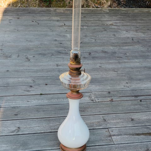Lampene har en dekorativ base, en skål for olje og veke og har en påfugl på toppen.
