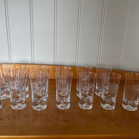 Selger glass og servise fra Magnor Glassverk samlet. Totalt 48 glass, (pluss noen ekstra glass og en vase som det er logo på), 29 tallerker, 1 serveringsfat og to serveringsboller.