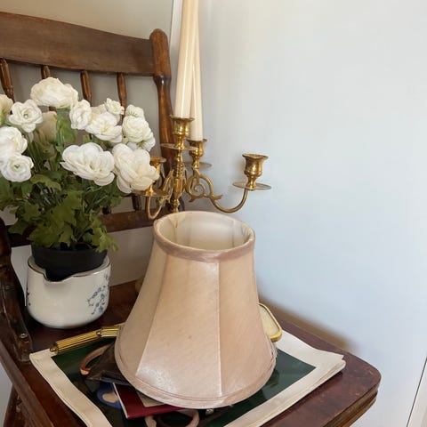 Selger en flott rosa lampeskjerm med frynser. Firkantet