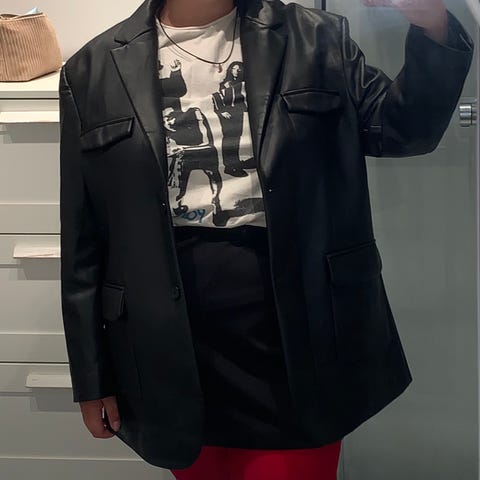 Svart skinnjakke med mix av glatt og semsket skinn. Lang på ermer. Røykfri