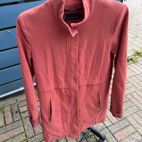 Pent brukt mørk blå vår/høstjakke til salgs. Jakken er tynn og uten for, med fast hette. Kan strammes inn med snøring i livet.