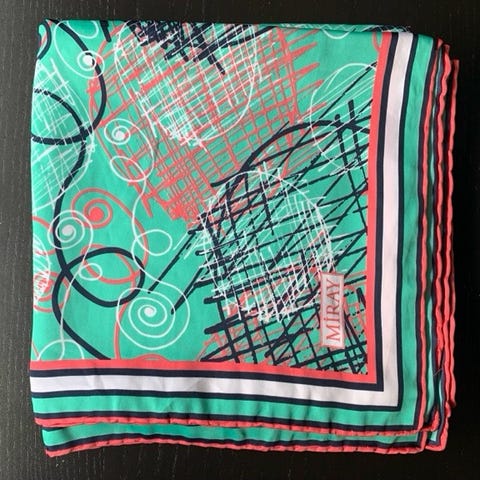 fint sjal med uglemotiv av polyester. har litt bruksmerker i kantene av sjalet, men det er ikke så synlig