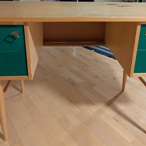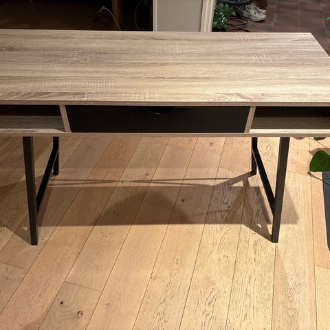 Stort L-formet skrivebord det går an å justere høyden med. Har kabelhåndtering og liten oppbevaring for enkle kontorrekvesitter.