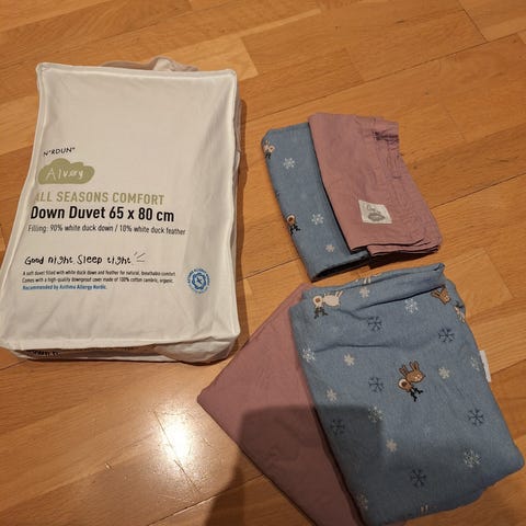 Fem laken til sprinkelseng, 70x160, kan følge med om ønskelig.