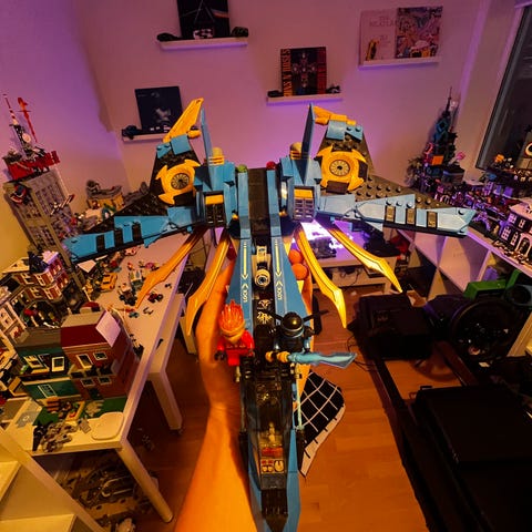 LEGO NINJAGO Ninja jagerfly i plast i rødt, svart og gult. Modellen har bevegelige vinger og cockpit. Den har en utskytingsmekanisme, så kan kan skyte ut "piler". Den lille delen i lilla og grå (se bruksanvisningen) medfølger IKKE. Dersom den skal sendes må jeg ta den litt fra hverandre.
