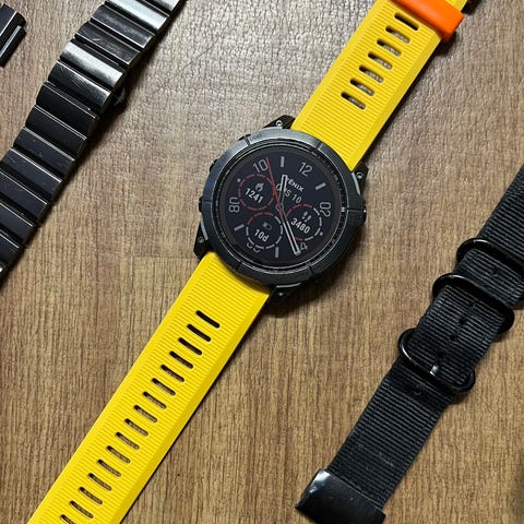 Garmin Fenix 7X Solar med både sportreim og titanlenke, pent brukt, komplett med eske, lader og kvittering. Ta kontakt for mer informasjon.