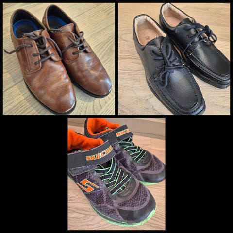 Et utvalg av barnesko i str 33 og 34. Skoene er synlig brukt, men likevel i god stand.